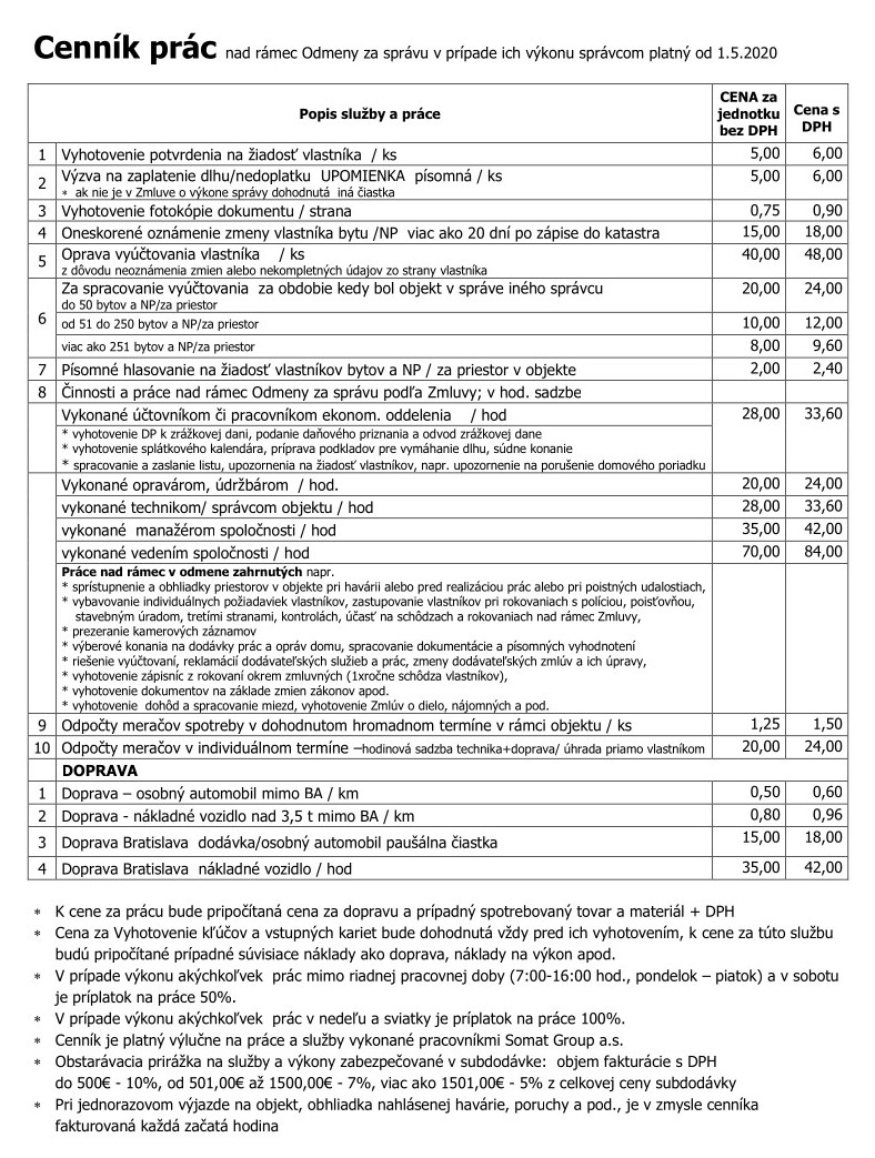 Cenník prác oddelenia Správy bytových domov pre rok 2021
